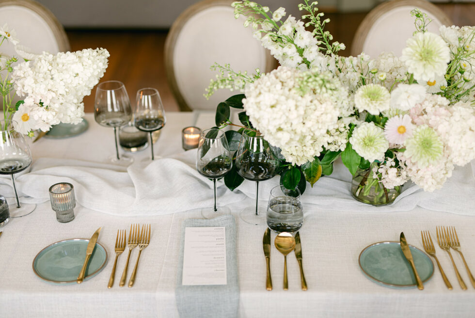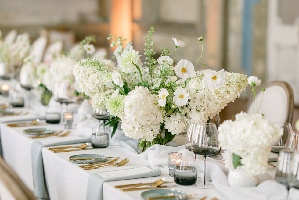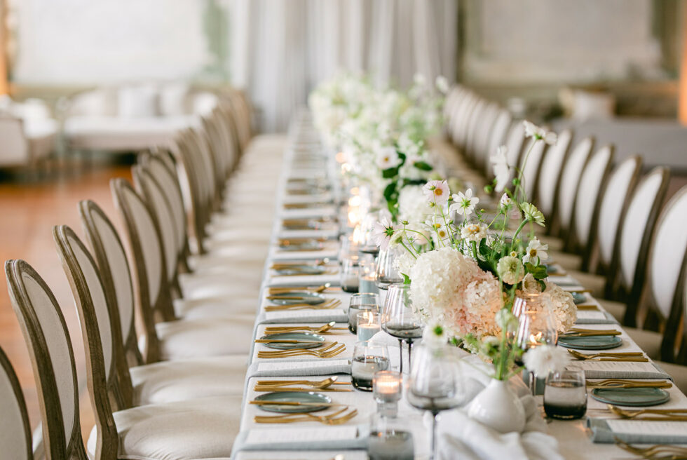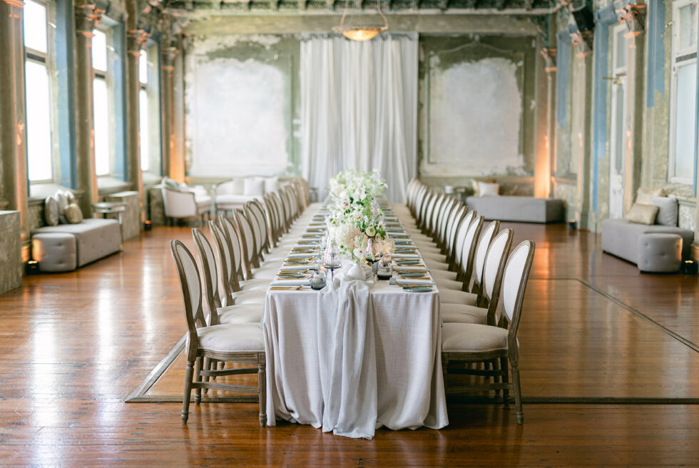 Gaze upon majestic chandeliers casting a soft glow over intricate ornamentation, evoking the grandeur of yesteryears, while textured linens and muted greens interplay with fresh blooms, seamlessly merging the classic with the contemporary.